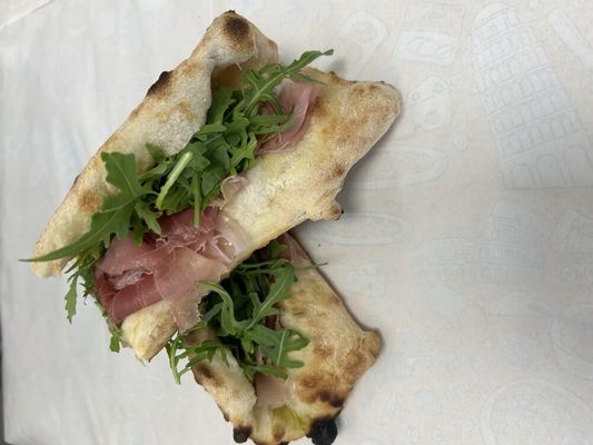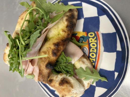 Pizza Sandwich filled with Proscuitto Emiliano, Fior di latte, Basil pesto and rocket