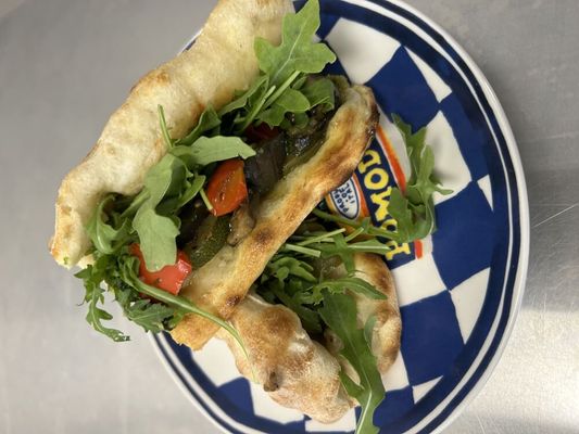Pizza Sandwich filled with Oven roasted seasonal vegetables, Fior di latte, Basil pesto and rocket